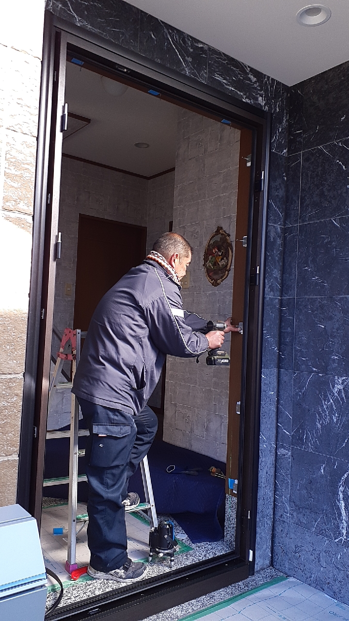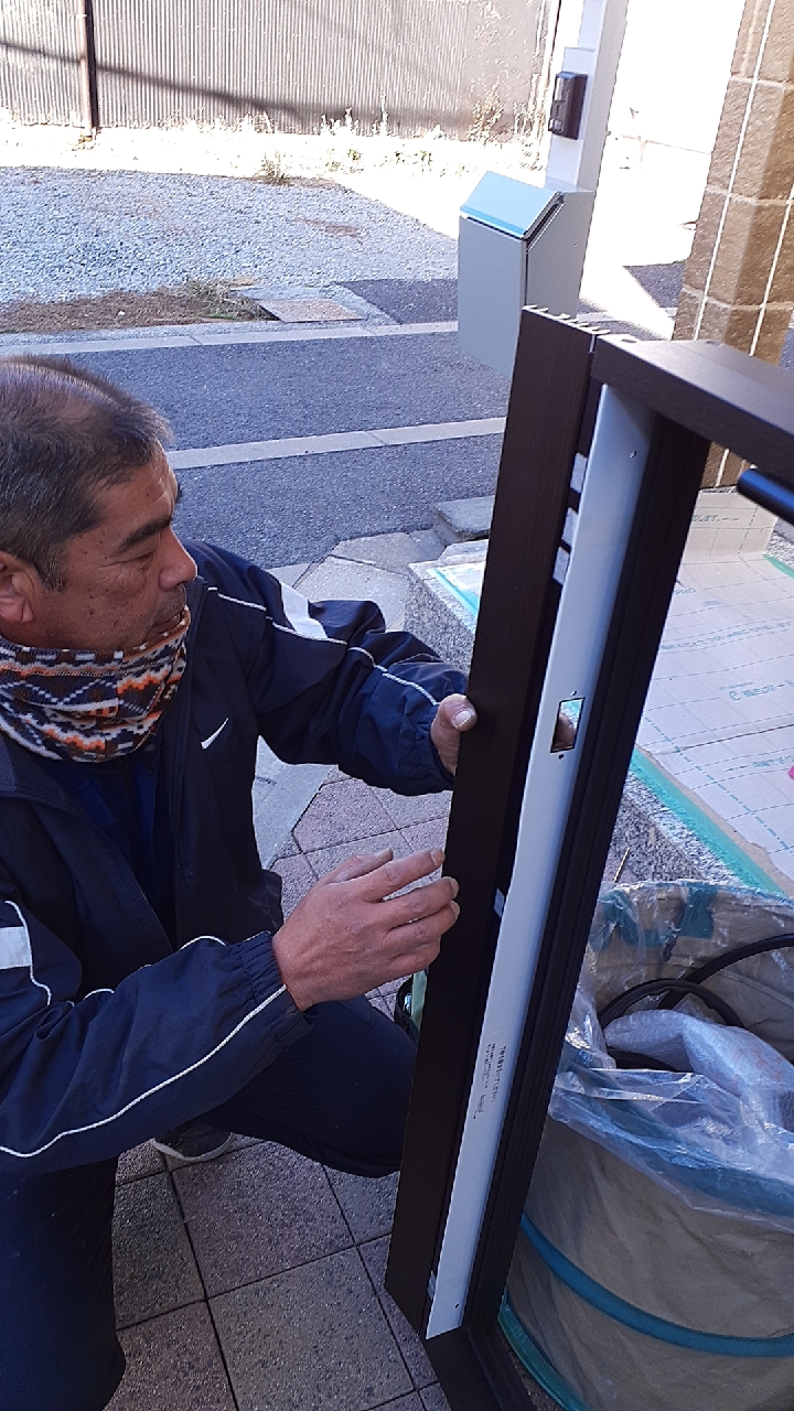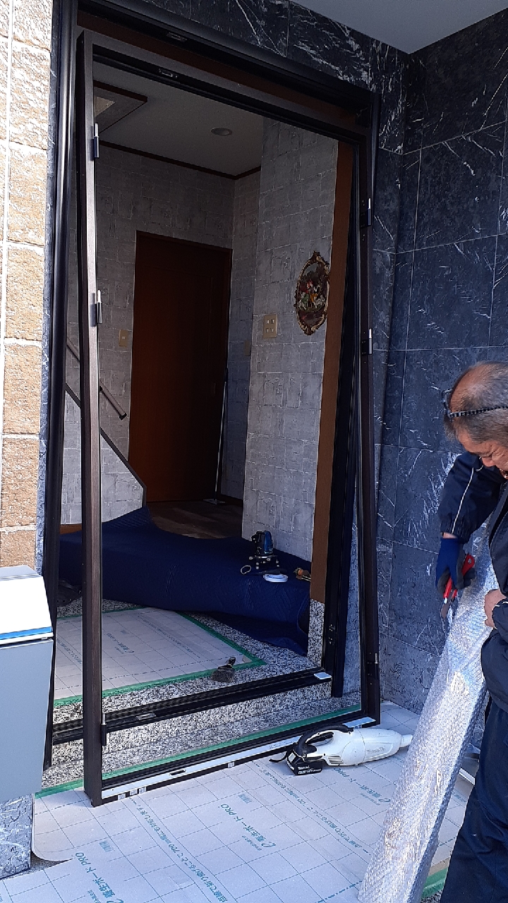 新枠の取り付け後に新玄関ドアと子扉を吊り込んでいきました。(2枚目の画像)