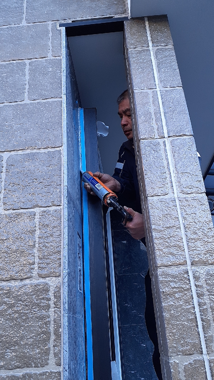 この時に時間の経過により生じた歪みを補正しながら新玄関枠を垂直水平に取り付けていきます。
