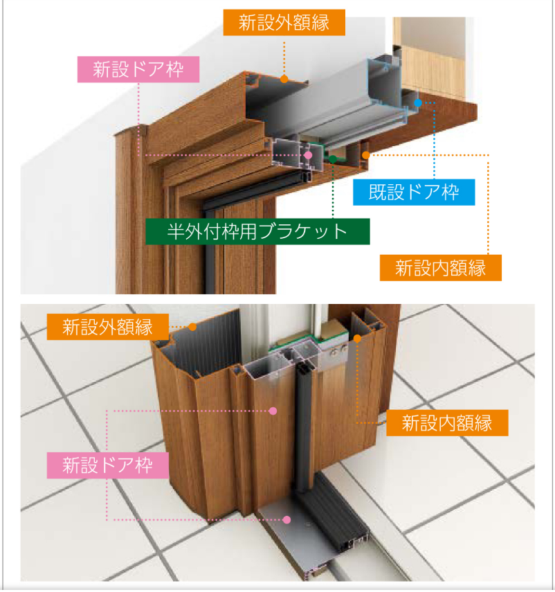 そこで、今回ご紹介させていただくのがリフォーム専用で今あるドア枠の中に新ドア枠を取り付けていく『カバー工法』の商品になります。