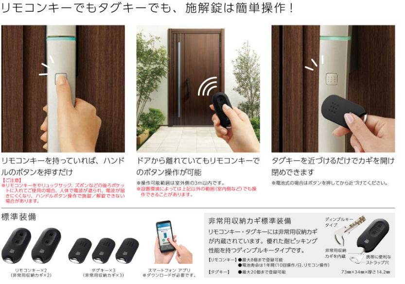 YKKAP製 スマートコントロールキー(電気錠)はタグキーやリモコンキーで施解錠するので、ピッキング防止機能など高い防犯性能があります。