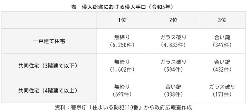 警察庁が公表している「侵入窃盗の侵入手口」(令和5年(2023年))のデータを見ると、いずれの住宅も、空き巣をはじめとした侵入窃盗の多くは、鍵の掛かっていない箇所から侵入していることが分かります。