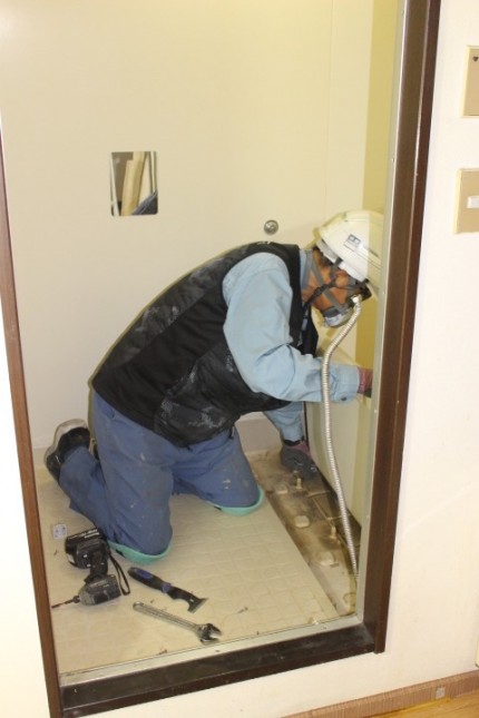 こちらが、ユニットバス解体撤去後の写真です。鉄骨造の建物です。床にはMDF板が敷いてありますが、補強した方が良さそうでしたので、12mmの構造用合板を張って補強することにしました。