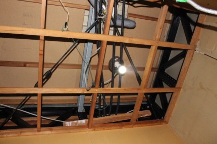 解体撤去後の天井部分はこんな感じでした。前は換気扇が無かったので、新たに壁に穴を開け、換気ダクトを通して新しいユニットバスで換気扇を使えるようにしました。電気の配線もこの状態で行ないます。