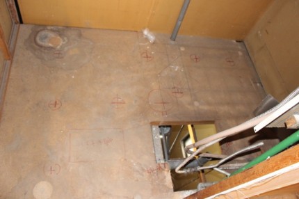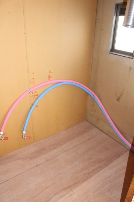 給水、排水の配管工事を行ない、床補強のための合板を張り終わったところが、こちらの写真です。