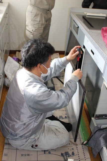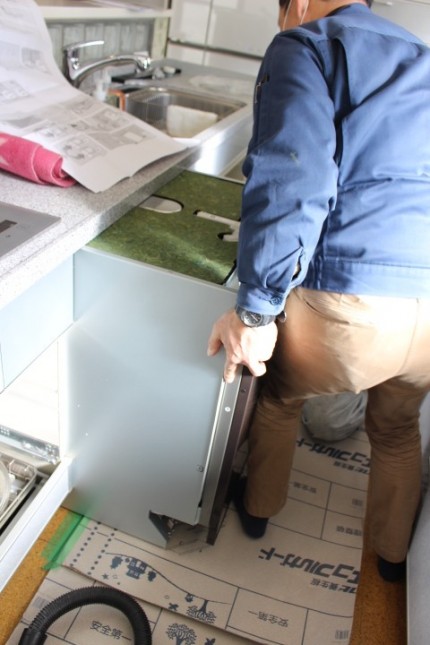 こちらは、以前の食洗機についていたドアの表面材を、新しい食洗機のドアに入れ替えているところです。