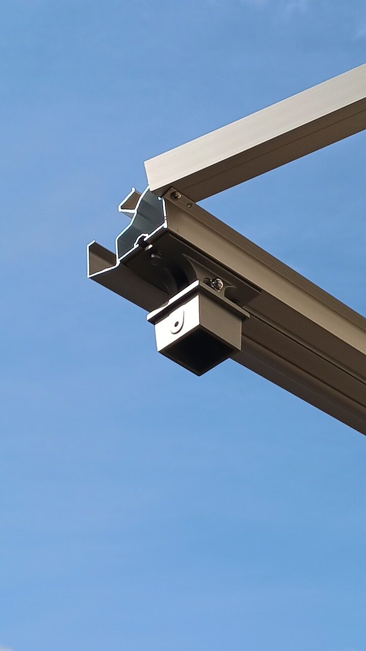 施工前② 巾3Mに対し、出幅部が片側1Mもう片側が2.3Mと斜めになっている場所でした。今回、YKKAP製ソラリアフラット型でしたら斜め加工での取付が可能ですので、その商品を取付する事となりました。