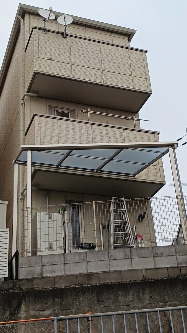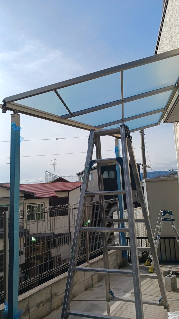 吹田市 1F アルミテラス屋根(フラット型)斜め加工での取付施工例です。