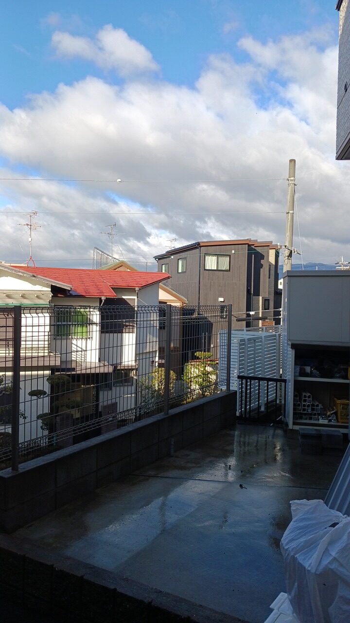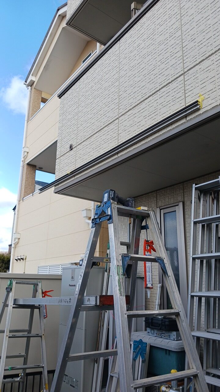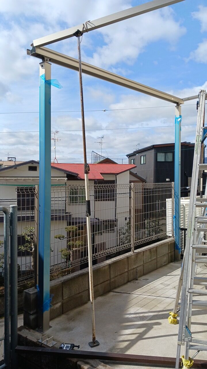 施行中⑨ 側面キャップをして、竪樋を新設テラス屋根の柱に沿わせて取付て行きます。