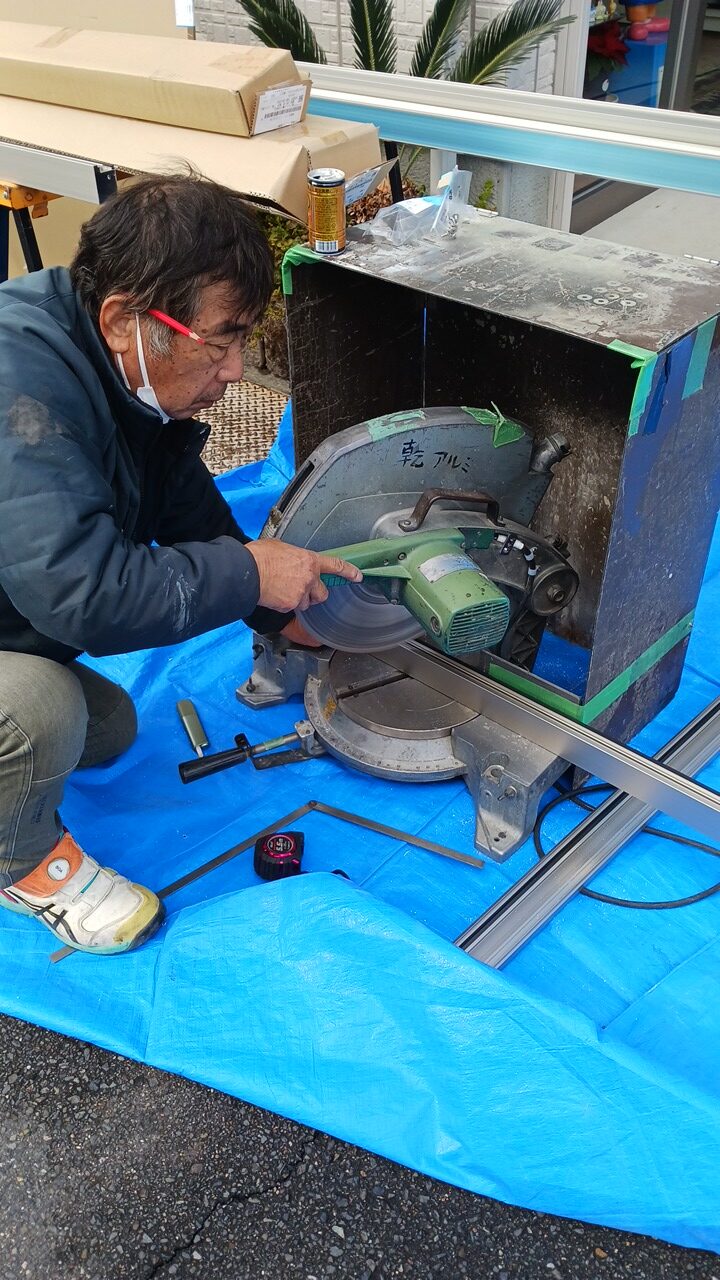 施行中③ 切断機を使用し、垂木を斜め加工していきます。現場に合せて一本一本違う長さに切断しないといけませんので、最初の実寸計測が肝心となります。