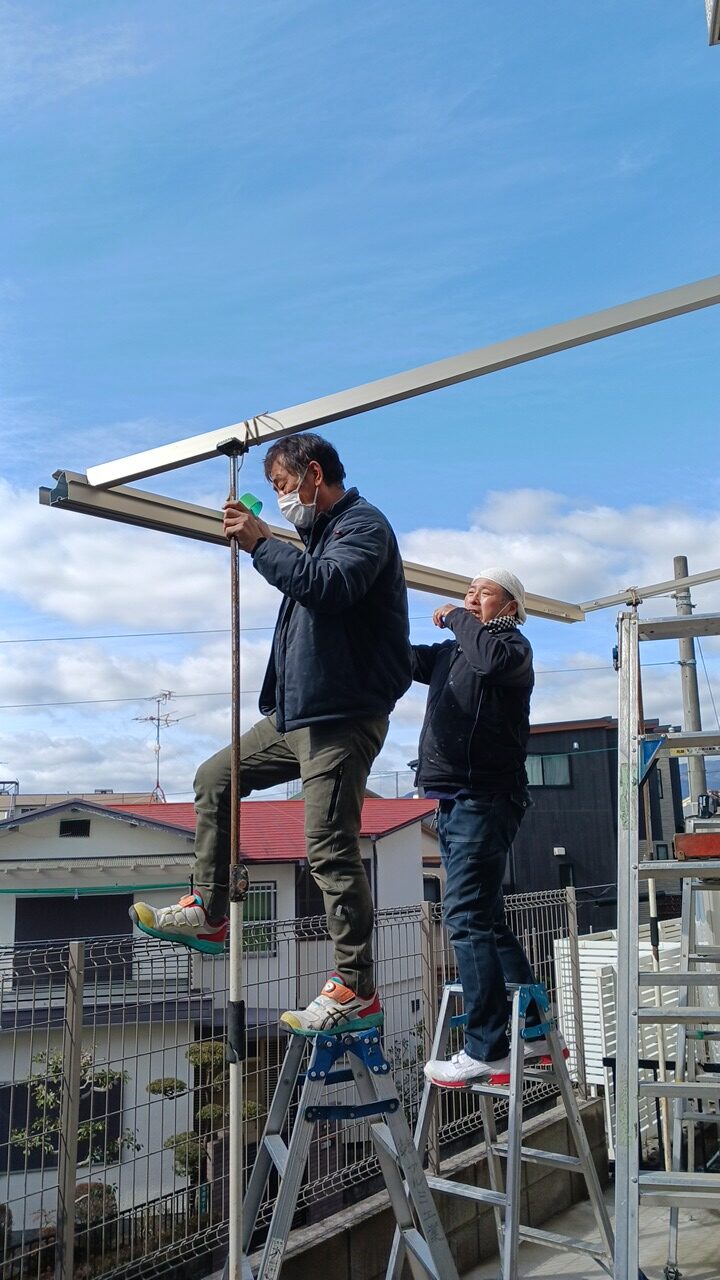 施行中⑦ 屋根材を1枚1枚違う寸法に斜め加工し取付て行きます。今回の屋根材は熱線遮断ポリカーボネートのクリアマットをご選択されました。