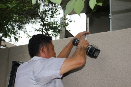 塀に振動ドリルでビスを取り付ける穴を開けていきます。