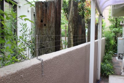 相談の結果、アングル金物を塀に取付してワイヤーを張る工事をさせていただくことになりました。こちらが完成写真になります。