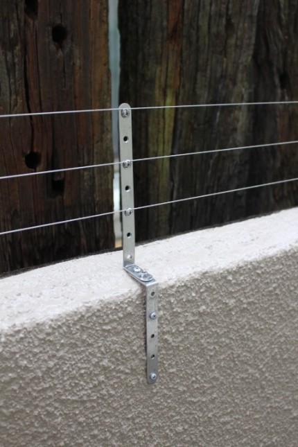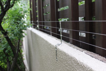 アングル金物の穴にワイヤーを通して、張っていきネコ除けにしました。15mほどの長さの塀にすべて取り付けいたしました。