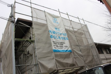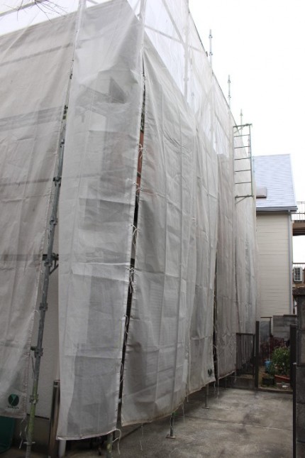 ピケ足場と呼ばれる仮設足場を組み、周りに養生シートを張っていきます。