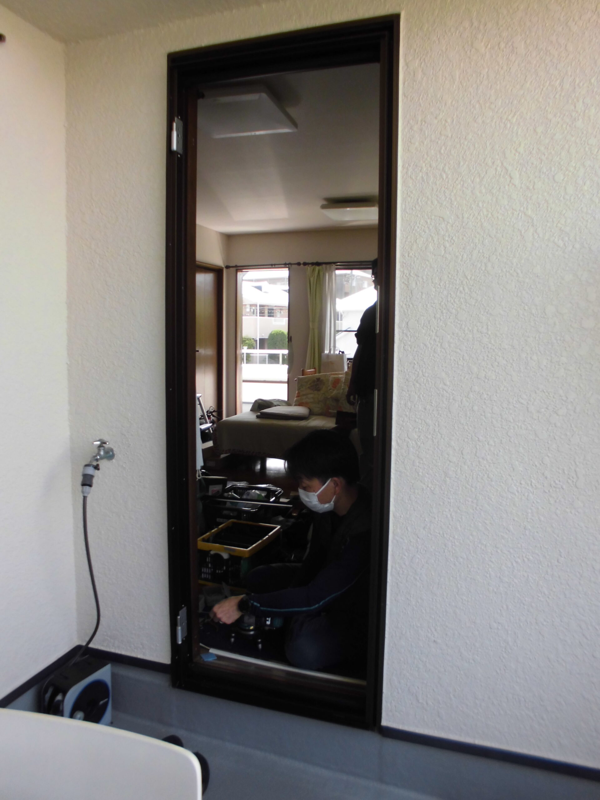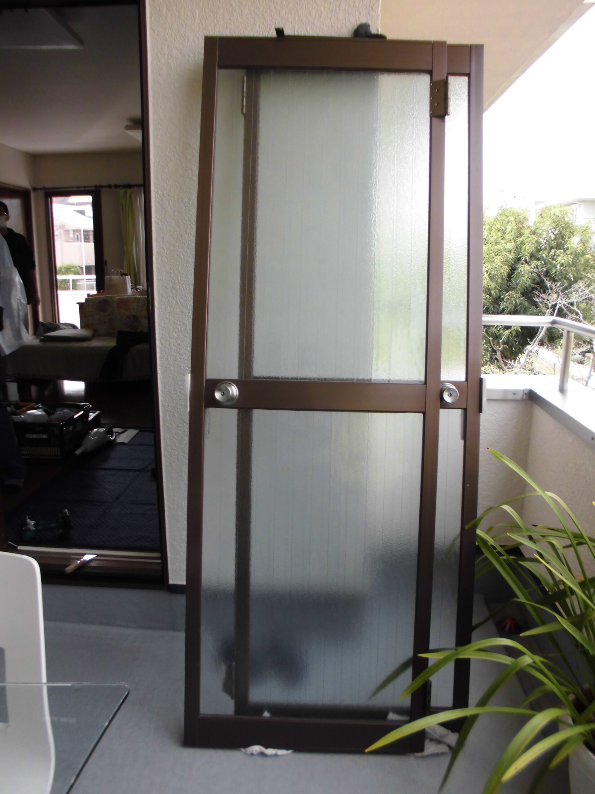施行中③ 新設枠の取付が完了しましたら、通風ドアを吊り込みます。