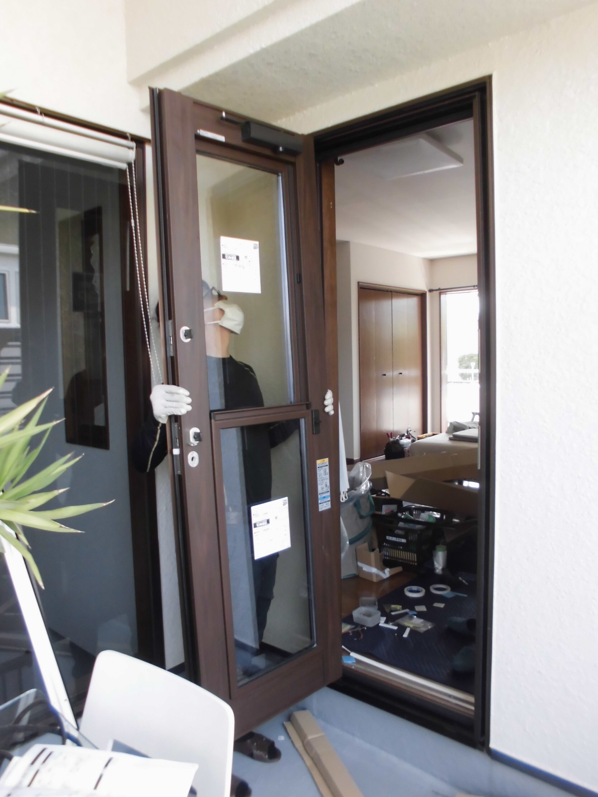 施行中④ ドアの吊り込み後、壁との隙間にコーキング材を注入し雨、風の進入を防ぎます。次に切断加工した外額縁、内額縁を新設枠に取付します。