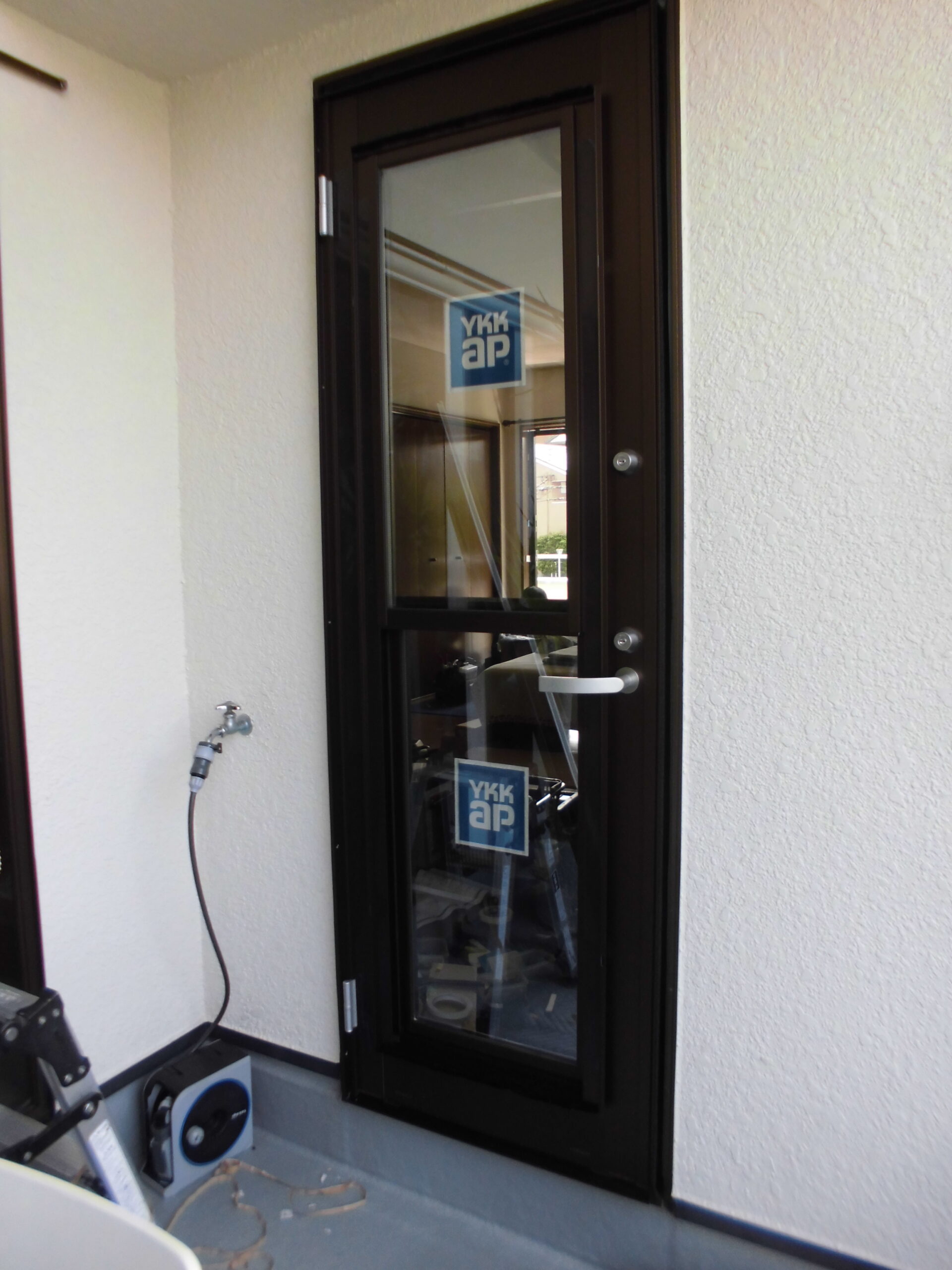 吹田市 2Fバルコニー出入口ドアをYKKAP製通風ドア横格子断熱タイプに取替例です。