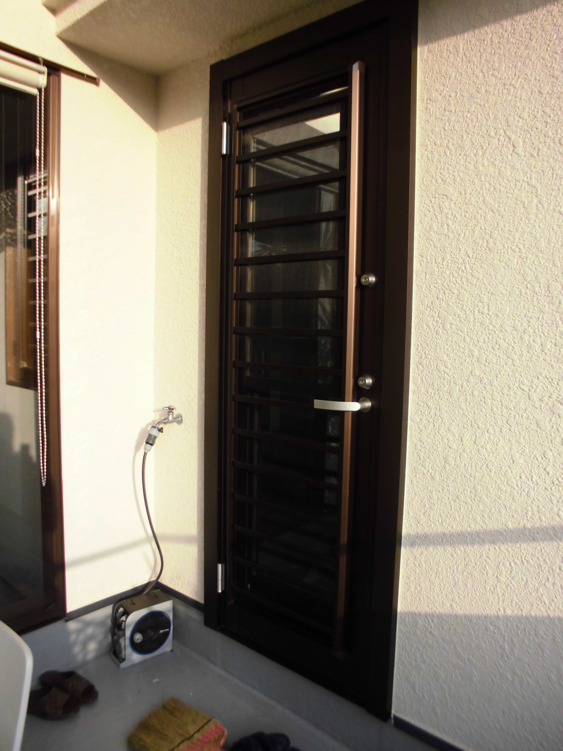 施工後 網戸付き格子を取付、ドアクローザーでドアの開閉スピード調整、施錠調整確認をして完成となります。今回ご採用の商品はかんたんドアリモ勝手口ドア断熱タイプ通風横格子タイプです。外部はアルミでブラウン色、内部は樹脂製でダークブラウン色を選択されました。施主様ご希望のドアを施錠したままで、硝子部が上下し通風出来、外部アルミ内部樹脂の複合タイプの断熱仕様です。