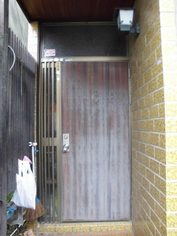 玄関ドア取替リフォームのご相談を受けました。写真がご自宅のランマ付玄関ドアです。お悩みは①ドア本体の面材が、長年の日光、雨風で色褪せでいる。②握り錠の鍵が掛かり難く、ドアノブが廻しにくい。との事でした。今回これらを解消するためにYKKAP製リフォーム玄関ドアドアリモで取替する事となりました。ドアリモは既存の玄関ドア枠のみを残して、その内側に新設枠を設置する事によって、壁などを壊さず1日で取替可能なリフォーム用商品です。