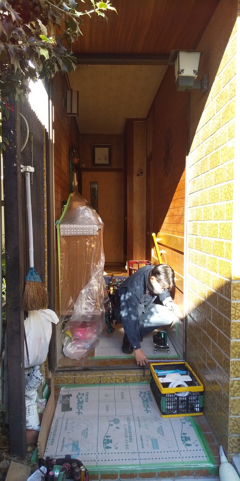 施行中③新設玄関ドア枠をはめ込み、レーザー墨出し器で平行、垂直の歪みの無い様に電動インパクトドライバーで左右縦枠、上部枠をビス止めしていきます。