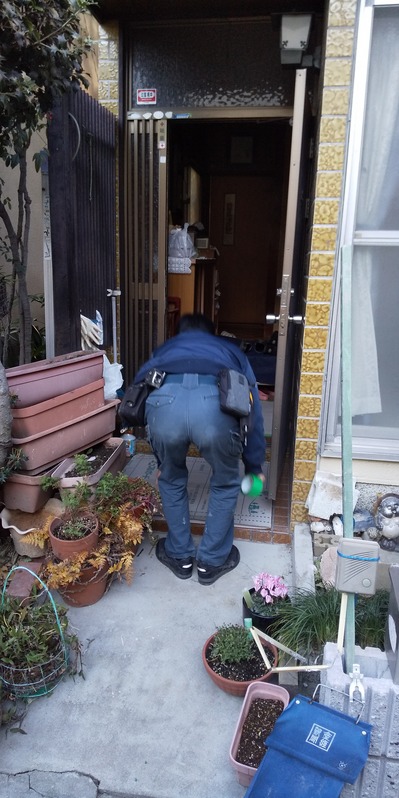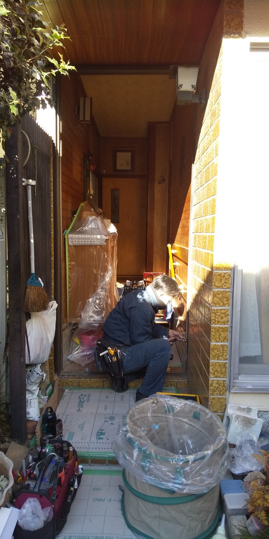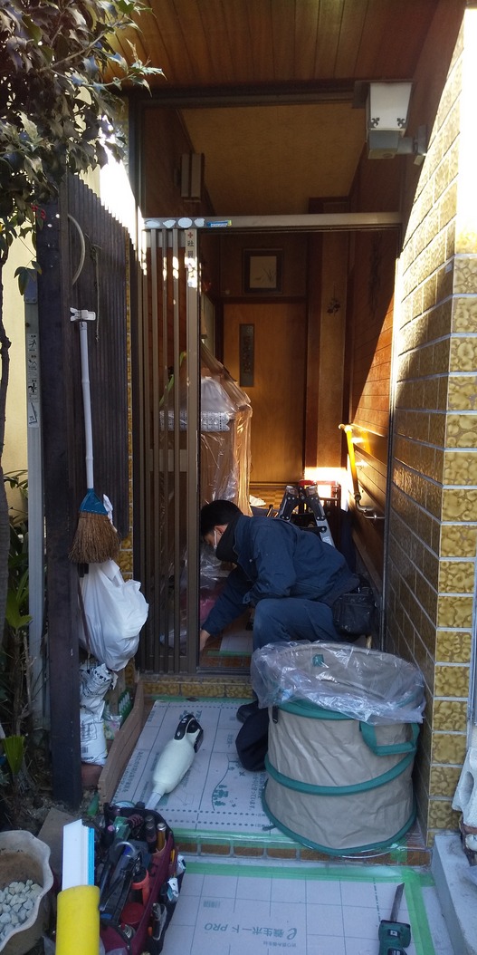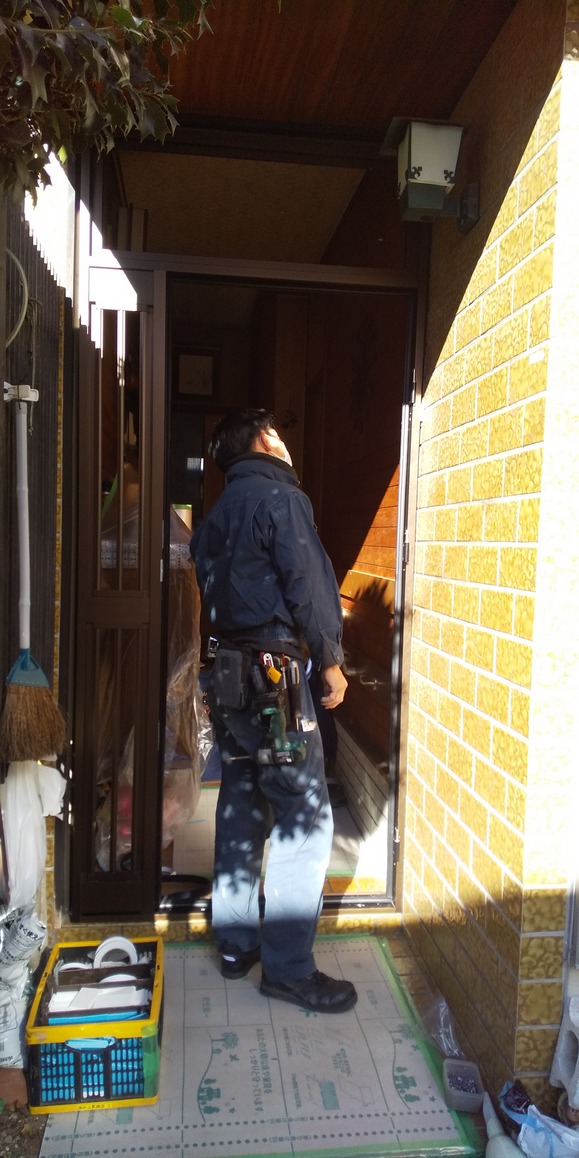 施行中②新設玄関ドア枠を取付て行きます。ビス止め部にパッキン等を設置しています。