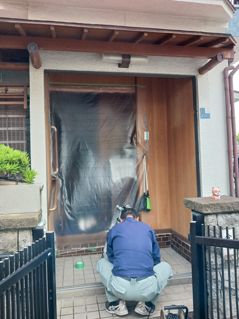 施行中④新設枠の取付が完了しましたら、引戸本体を1枚ずつレール内にはめ込みます。その後、既存枠と新設枠の隙間に雨水、風の進入を防ぐ為、コーキン材を充填します。次に内外部に既存の古い引戸枠を覆い被す様に、アルミ化粧額縁を取付します。