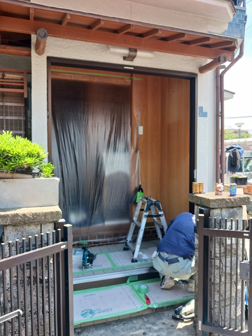 施行中②綺麗に無駄なものを取り除いた既存枠内に、事前に採寸オーダー製作した、新設引戸枠をはめ込みます。