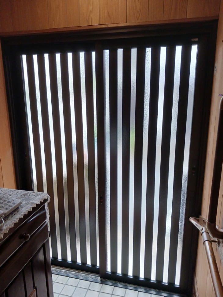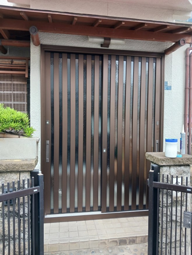 施工後①お施主様のご希望通り、硝子面を少ない太い格子デザインで戸先と召し合わせ部の2カ所で施錠、キーはピッキングし難いディンプル仕様です。ランマ無しにすることで引戸の高さも30センチ程高くなりました。