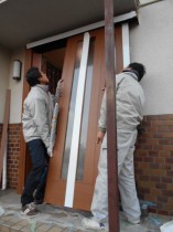 玄関引戸のたて枠、下レール、上枠の順番に取り付けていきました。
