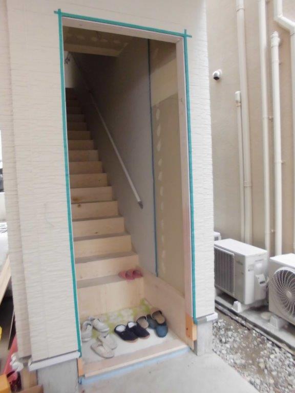 施行中①事前に打合せ、図面作成しオーダー製作(1か月程納期が掛かります。)しました、スチールドアを取付て行きます。最初にスチールドア枠を開口部にはめ込んで行きます。