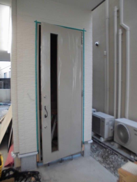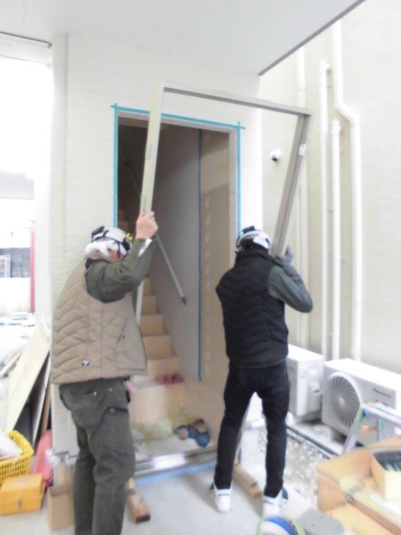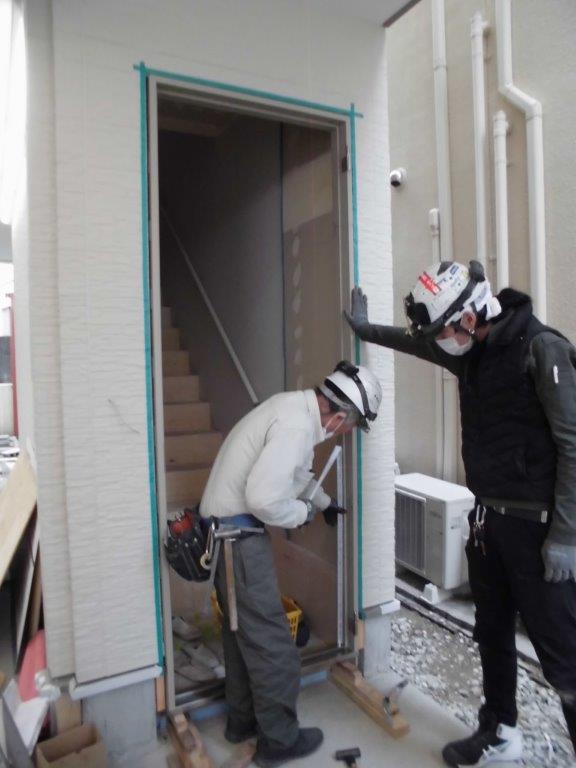 施行中④スチールドア枠の取付が終わりましたら、ドア本体を丁番に吊り込みます。スチールドア本体は30㎏位は有りますので、職人2人で慎重に吊り込みます。