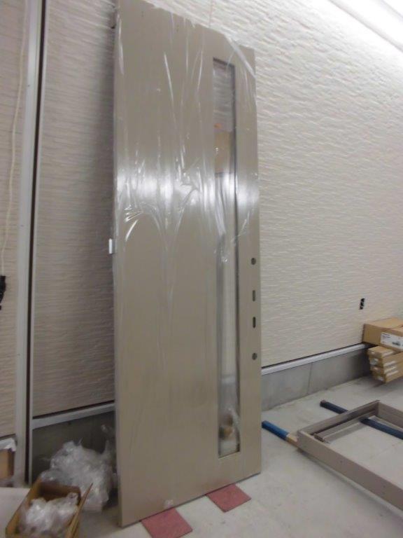 施行中③新設のスチールドア本体です。工場で焼き付け塗装までして仕上げています。