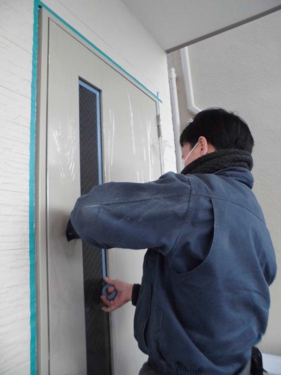施行中⑤ドア本体の開口部に硝子を取付て行きます。硝子をはめ込み固定、マスキングテープを貼り、コーキン材を充填し仕上げます。