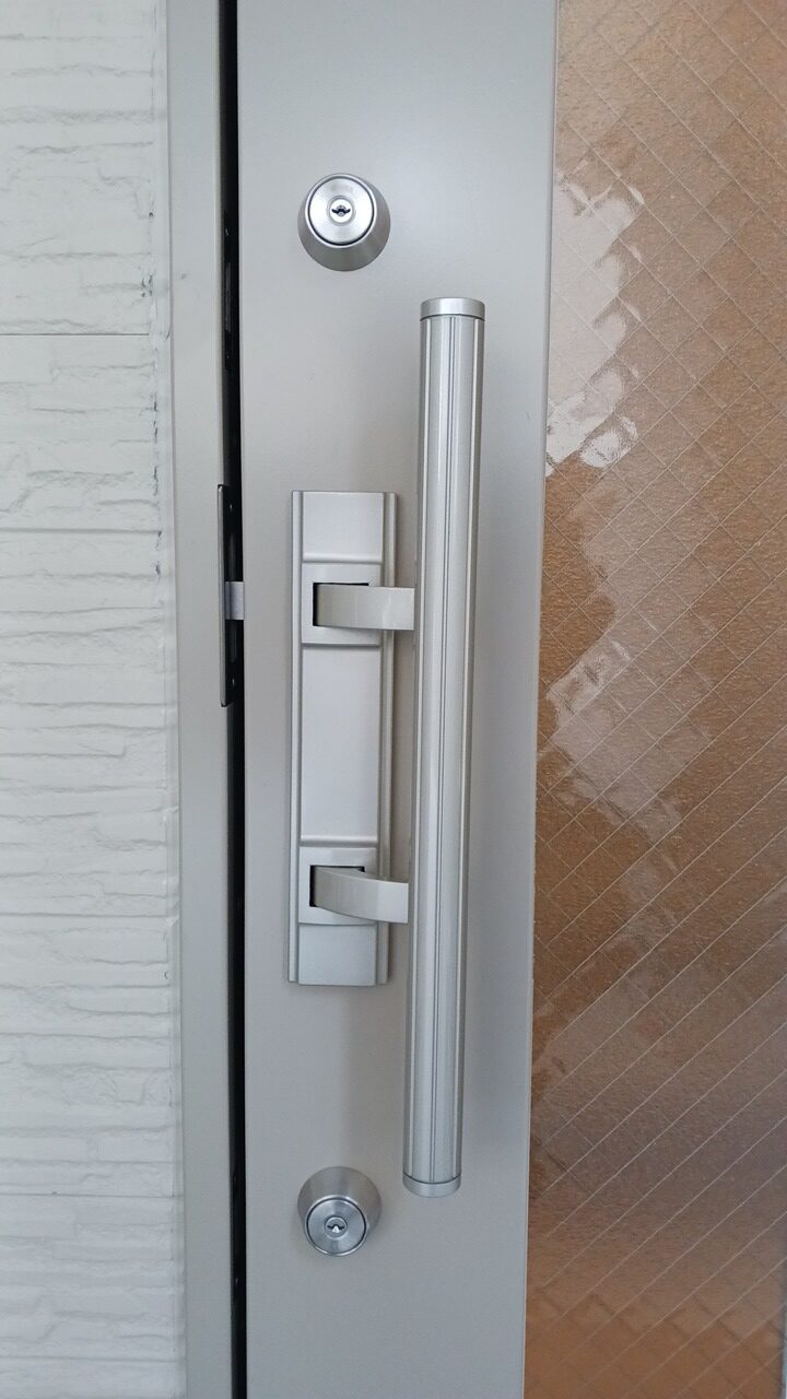 施行中⑥ドア本体にハンドル、シリンダー、ドアクローザー等金物を取付て行きます。今回はプッシュプル錠を選択されました。