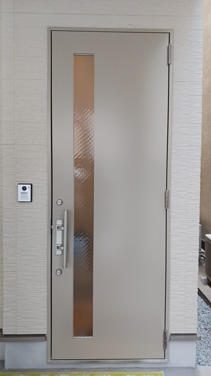 施工後 ドアの閉扉スピード調整、施錠調整をして完成となります。今回のスチールドアは事前打ち合わせで、色決めをし焼き付け塗装迄していますので、現場にて塗装仕上げするより、大変綺麗な仕上げとなっています。