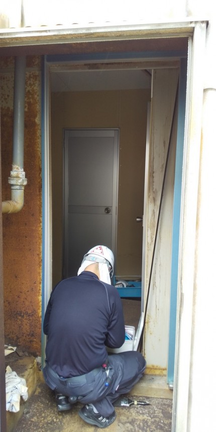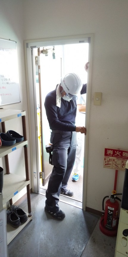 枠が取付出来たら、ドアを吊りこみ開閉の確認を致します。