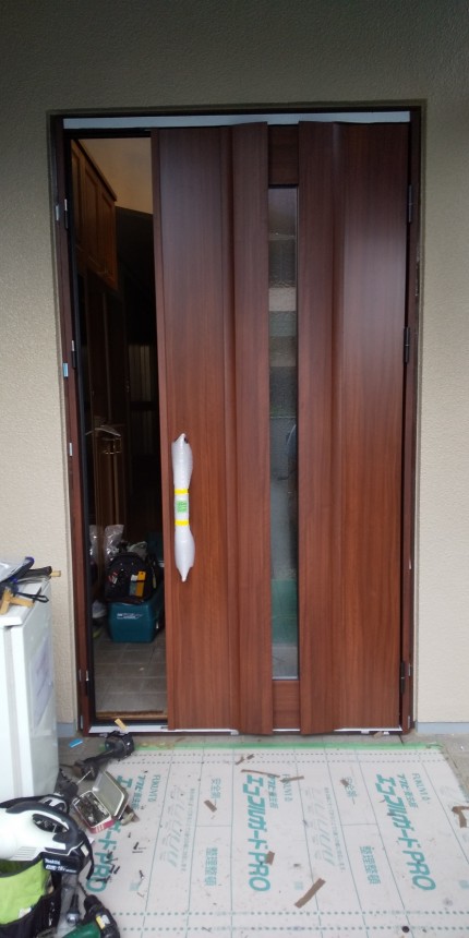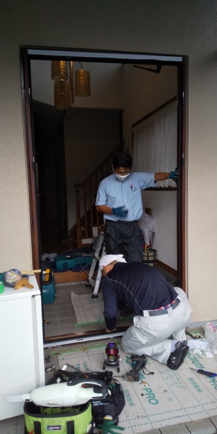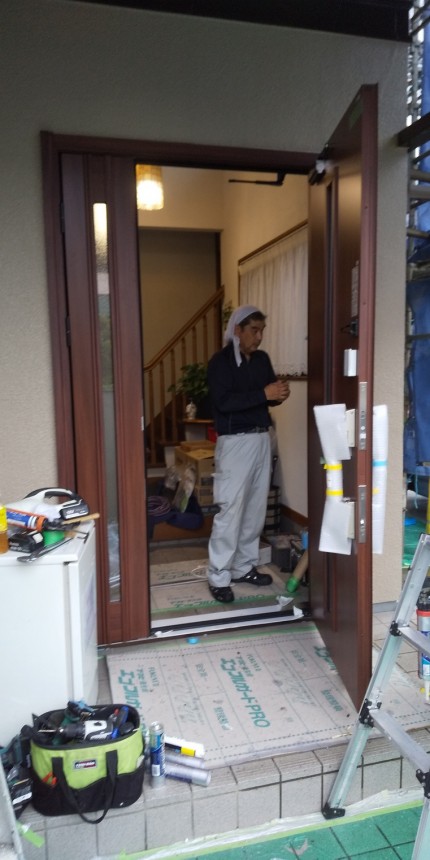 雨は施工終了まで止むことはありませんでしたが、しっかりと玄関は取付けることができました。
