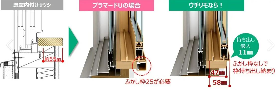 カバー工法とは、既存枠の中に新しい枠をお取り付けする施工方法で、既存枠を解体しないので、外壁や内装の補修が必要ありません。