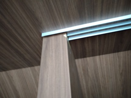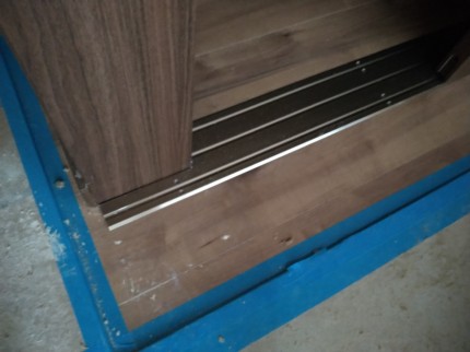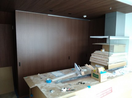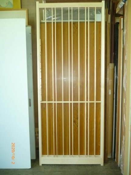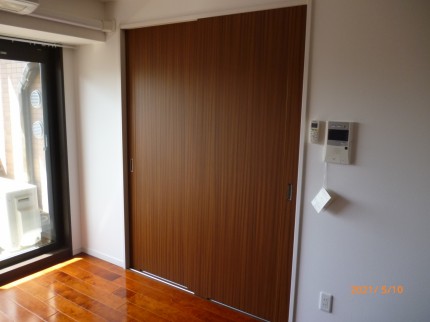 取り付けが完了しました。今回の3枚引き違い戸の表面材は、茶色の木目のメラミン化粧板です。