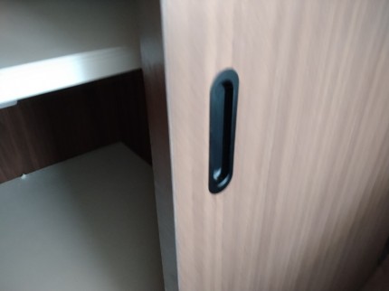 扉の茶系の色がやや暗めなので黒の引手がご希望のようです。ほかにも引手の色はいろいろありますので、イメージを教えていただければお選び出来ます。