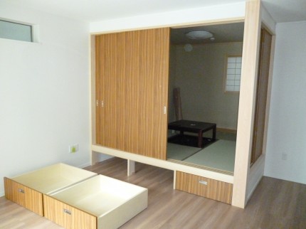 下部の引き出しは、タタミコーナーの上床のデッドスペースに大型の引出しを3台製作しました。季節製品等の収納に役立ちそうです。
