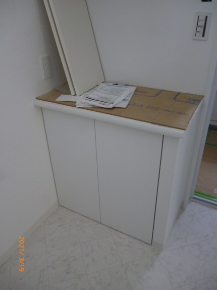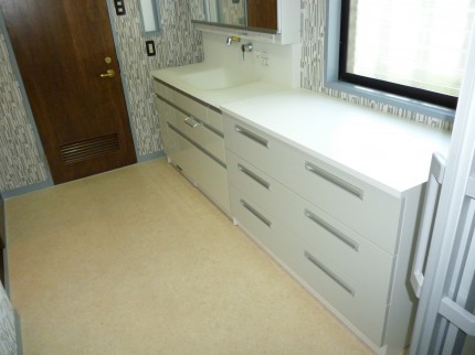 これは左側の既成品の洗面化粧台の右横に引き出し式のリネン収納を作って欲しいとのことでお作りしました。