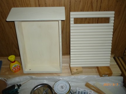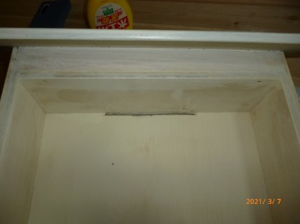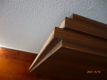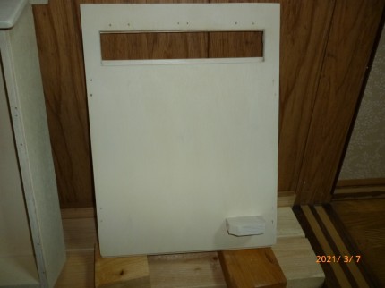 天井が奥に向かって斜めの勾配があり、側板の形状が変わってます。扉の上部は側板の上に合わせて下部は底板の下部より20mm下がった位置になるように作りました。
