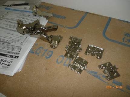 スライド丁番は扉の外側から見えないので納まりがスッキリと納まります。また、閉じるときにバネの力で最後引き寄せて閉じます。今回はバネ付とバネ無しを組み合わせました。