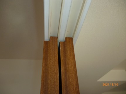 中心のH型の木製の部品は建具の上部の框材の厚みが薄くなっている為、反りで開くのを防ぐ部材です。