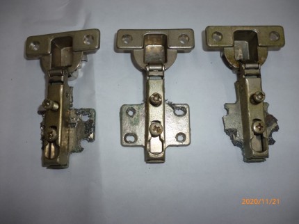 写真は持ち込んでいただいた扉についてた家具用の丁番です。かなり痛みが激しく、特に吊元の座金が風化したような状態でした。