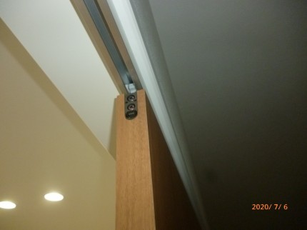 上部は上吊り式で、ソフトクローズ機能の戸車を使用しました。建具を閉じるときに5㎝ほど手前からゆっくりと戸が閉まる為、指詰めの危険が軽減されます。