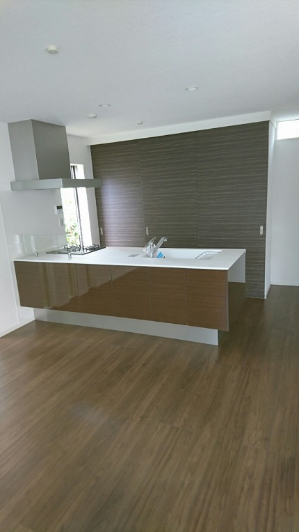 このキッチンは、幅2700mmのスペースに幅900mmの3枚引違戸を被せるように設置してます。