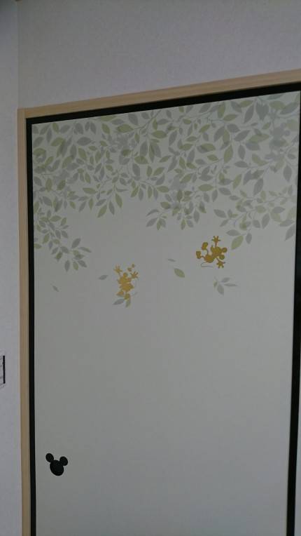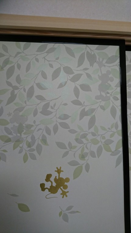 新緑の柄の襖紙の中にミッキーマウスのシルエットが隠れるように大人のデザインをされてます。