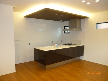 引戸を閉じると、壁面全体と一体化して壁のように見えます。キッチンのコーナーが小さく見えますが、リビングの奥行が広いためです。